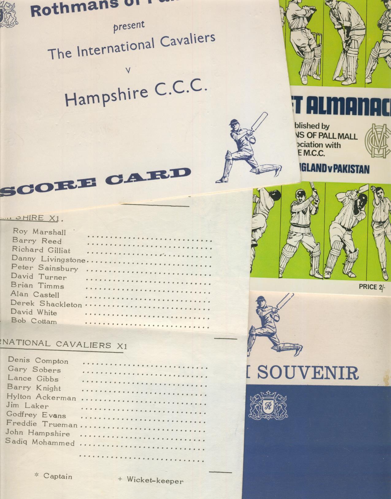 Scorecard, teamsheet, Rothmans almanack and wallet - all relating to the match played at Tichborne Park on July 30th 1967. The scorecard is completed in ink. Rothmans sponsored the International Cavaliers, hence the inclusion of the almanack and wallet.