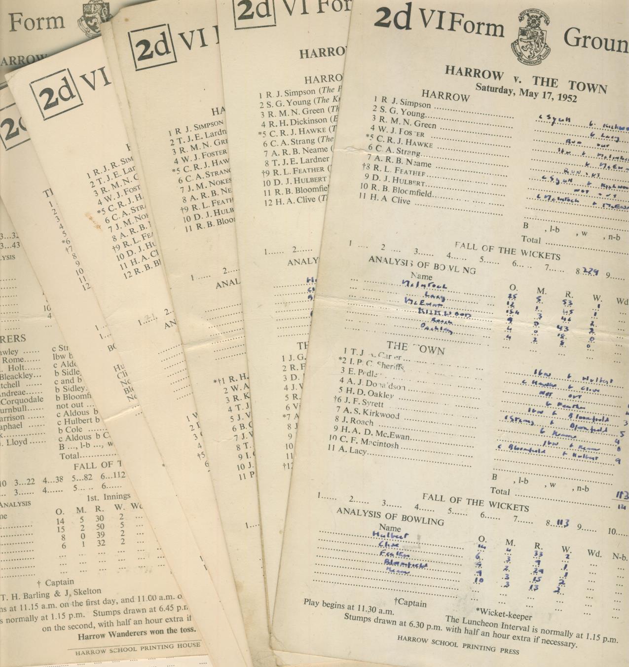 A collection of 13 scorecards from 1952 and 1953, all played on the VI Form Ground. From 1952 the oppponents were: The Town, The Butterflies, The Free Foresters, The M.C.C., Malvern, Haileybury and I.S.C., The Harlequins, I Zingari, Harrow Wanderers and finally The Cock House Match (The Grove v Moretons). The two scorecards from 1953 were against Malvern and Harrow Wanderers. Also included is the Harrow v Eton match played at Harrow in July 1970. Noted opponents include Sir Michael Bonallack, who batted at number 11 for Haileybury (the same year as he won the Boys Amateur Golf Championship); EW Swanton, who opened the innings for the M.C.C.; and Viscount Cobham, who scored 63 for The Butterflies.