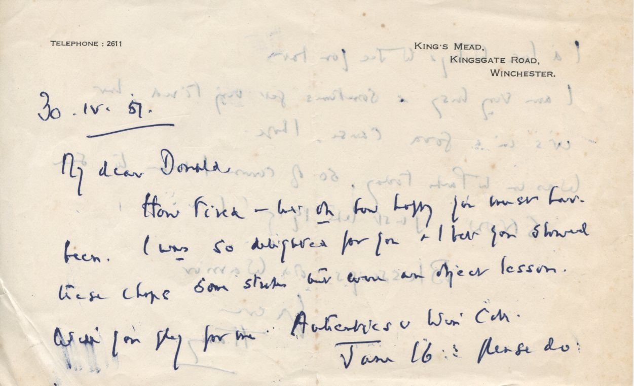 Handwritten letter in ink on headed notepaper, dated 30th April 1951, from Altham to D.J. Knight (Surrey & England), asking him to play for the Authentics against Winchester College. Also refers to Knight's century for an Old England XI against a Warwickshire XI at Edgbaston a few days previous. Knight, who was 57 years old, scored 112 out of 205, coming in at number 5. Finishes "Blessings Old Warrior. Yours Ever, Harry".