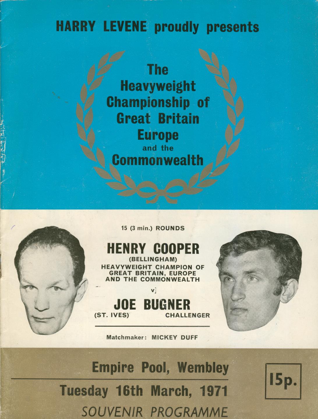 Official souvenir programme for the Heavyweight Championship of Great Britain, Europe and the Commonwealth, held at the Empire Pool, Wembley on March 16th 1971. In a controversial decision Bugner won the fight and Cooper never fought again. Signed to centre page by Ken Buchanan who was, at the time, undisputed lightweight Champion of the World.
