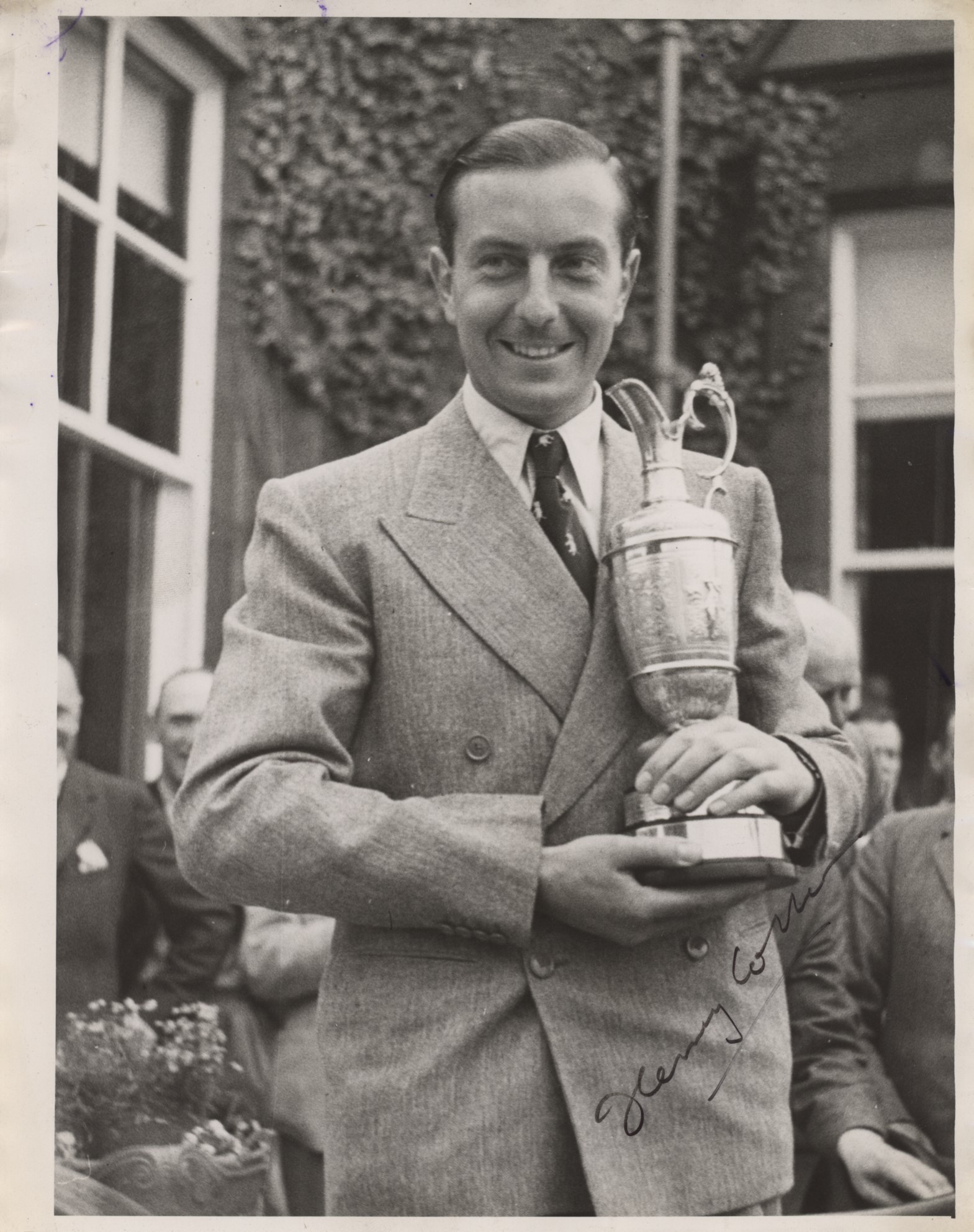 Original Press photograph of Henry Cotton after winning the 1937 Open Championship at Carnoustie. Signed very nicely by Cotton in black ink to front.