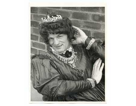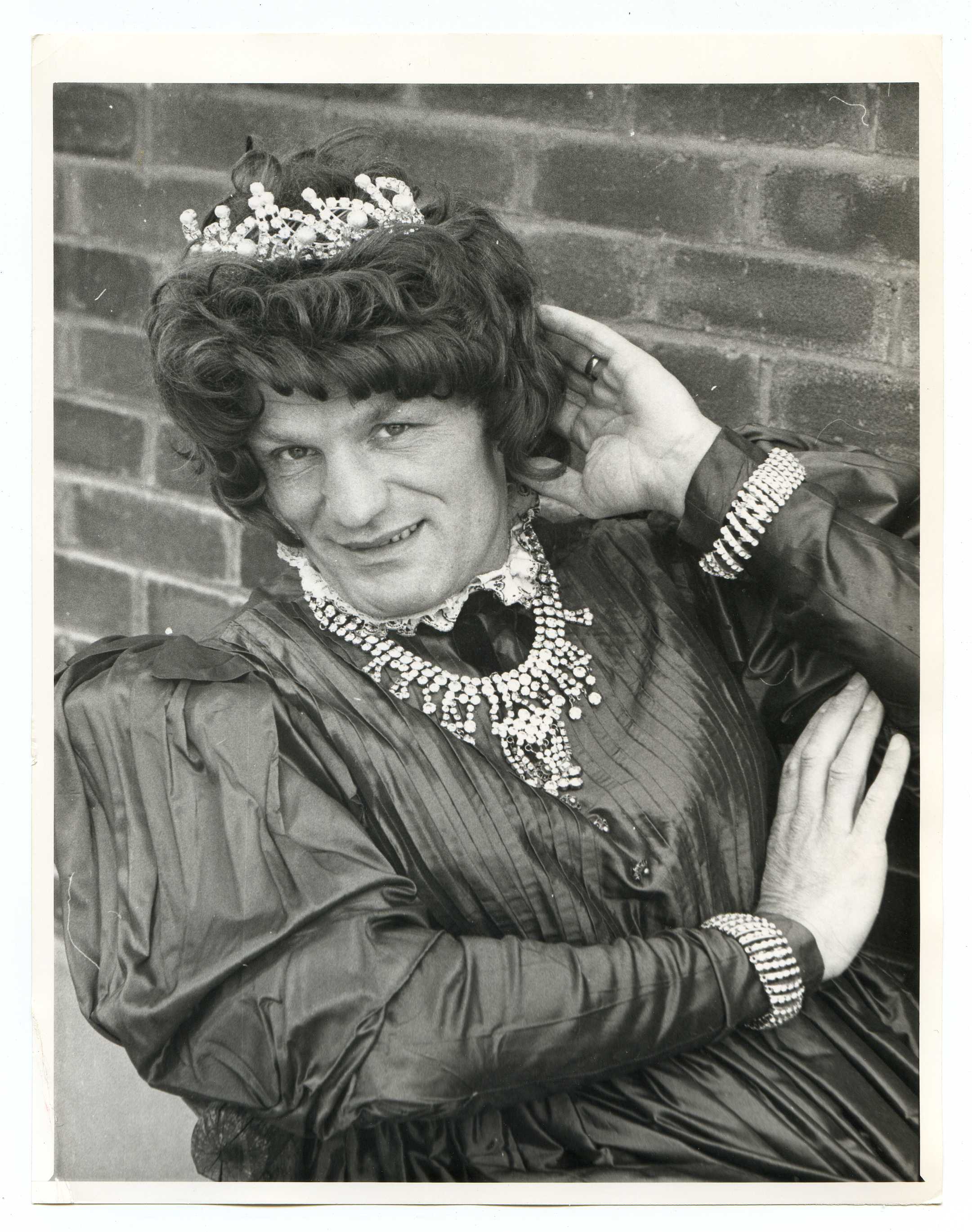 Original Press boxing photograph of Cooper dressed in drag for a charity pantomime performance.