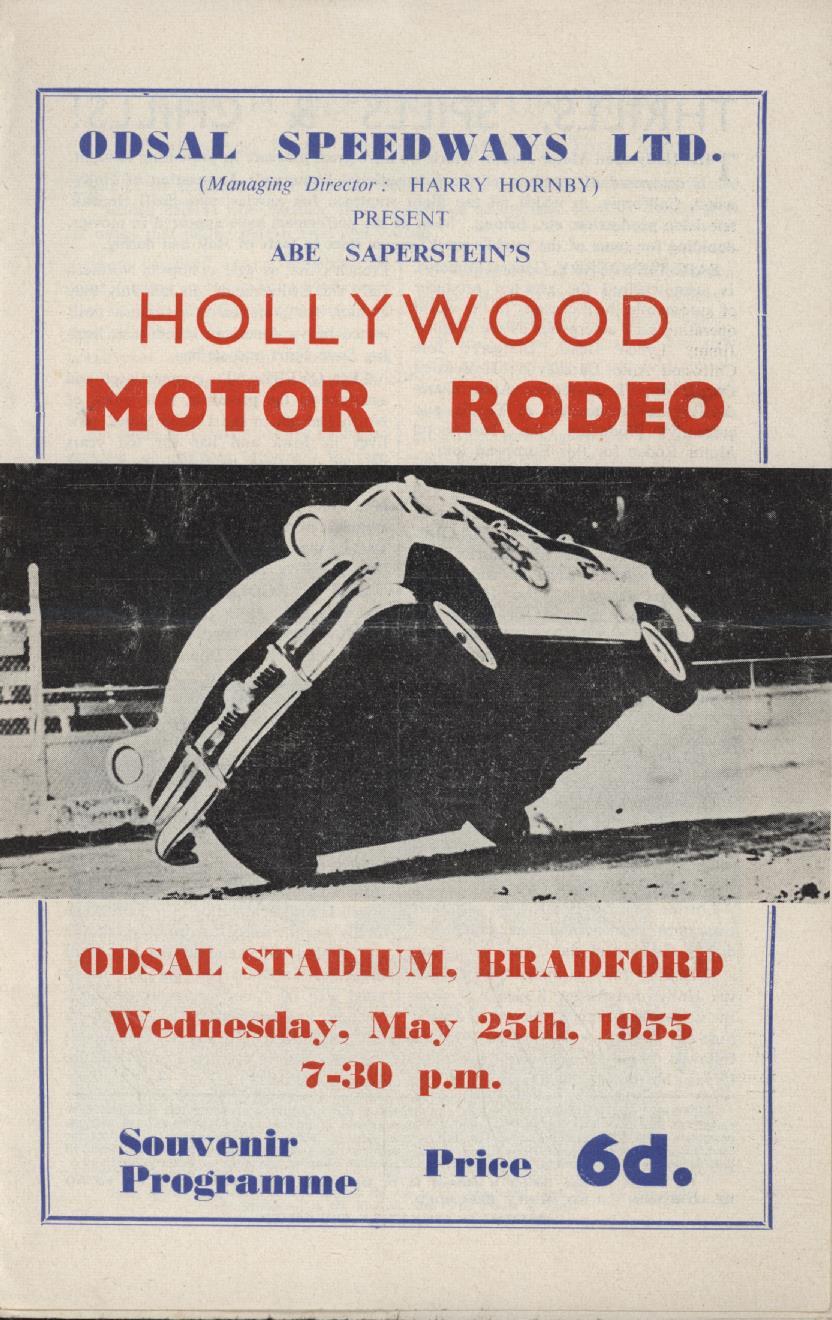 Souvenir programme for the exhibition motor event staged at Odsal Stadium, Bradford on 25 May 1955, featuring American drivers from the International Stuntmen's Association of Hollywood performing stunts such as 'Hell Driving' and 'Deliberate Crash Roll Over'.