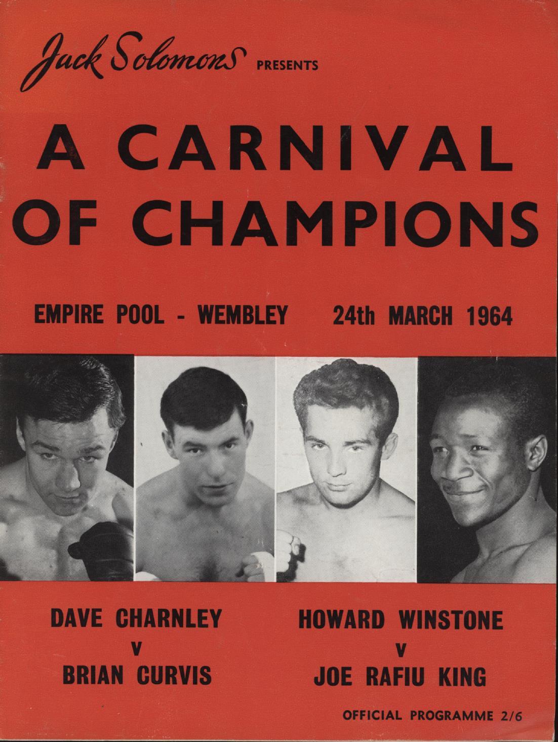Official programme for "A Carnival of Champions" at Empire Pool, Wembley, 24 March 1964. Winstone v King joint top billing with Dave Charnley v Brian Curvis.