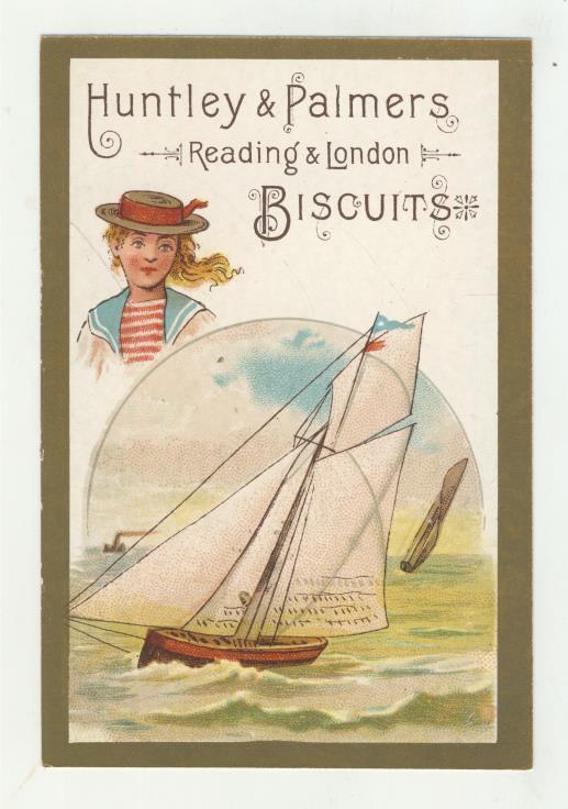 Original trade card published to advertise Huntley and Palmers Biscuits. Printed to reverse with all the different types of biscuits that they produced.