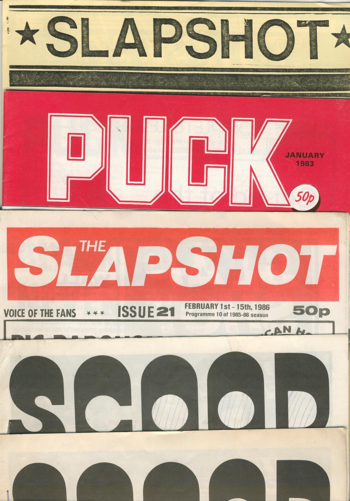 A group, of 5 ice hockey magazines published in the early 1980s. These include two editions of "Scoop", edited by Ian Whitehouse in Whitley Bay (issues 4 & 5, from Feb/March 1981); two issues of "Slapshot", edited by Gary Wilkie in Sunderland (Wembley Special issue for May 1985 and issue 21 from Feb 1986); one issue of "Puck", edited by Phil Drackett in Norwich (issue for Jan 1983).