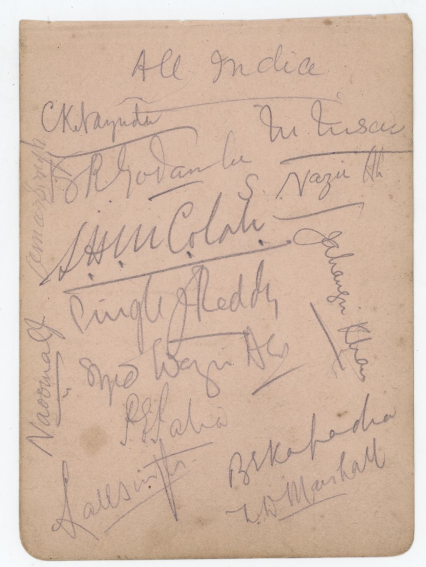 Autographs of 14 members of the Indian cricket touring party to England in 1932 - CK Nayudu, Lall Singh, SHM Colah, SR Godambe, Naoomal Jaoomal, L Amar Singh, BE Kapadia, N.D. Marshall, S. Nazir Ali, P.E. Palia, S. Wazir Ali, Mahomed Nissar and Jahangir Khan. One name is unidentified. The team played their first official Test at Lord's, June 25th-28th, losing by 158 runs.