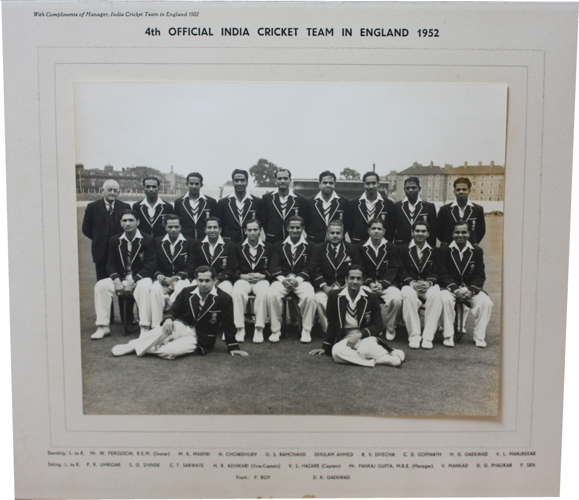 Official team photograph of the Indian Cricket Team that toured England in 1952. Full team legend to lower mount - players include Hazare, Mankad, Umrigar, Manjrekar and Ghulam Ahmed.