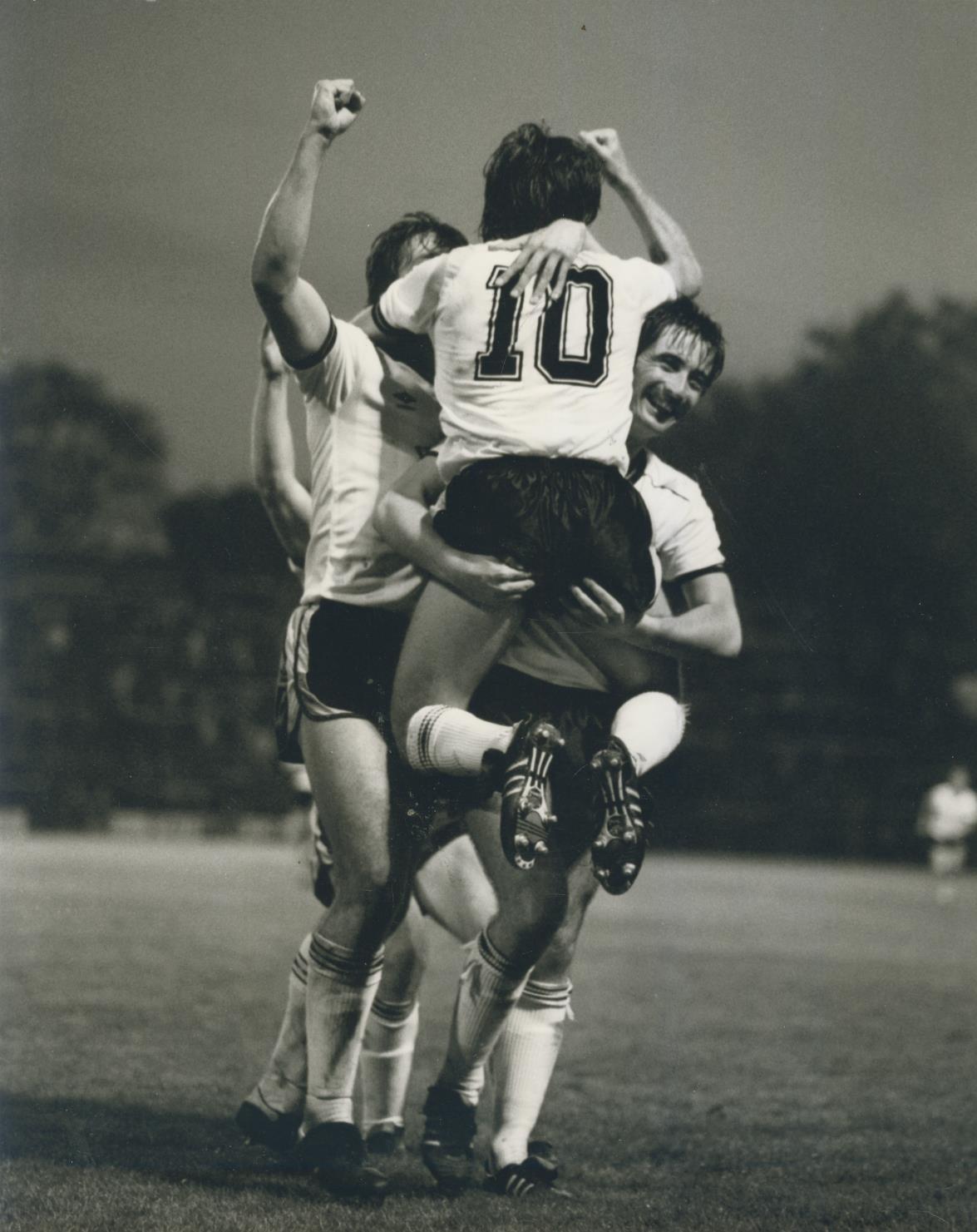 Dean Coney, Ray Houghton and Robert Wilson celebrate after Fulham score against Wimbledon on November 11th 1984.