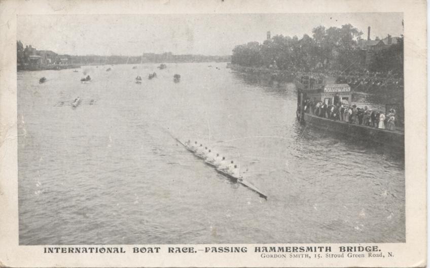 Rowing postcard. Published by Gordon Smith. Titled: International Boat Race Passing Hammersmith Bridge. Postally used and dated 1906, with handwritten message on reverse. In good condition