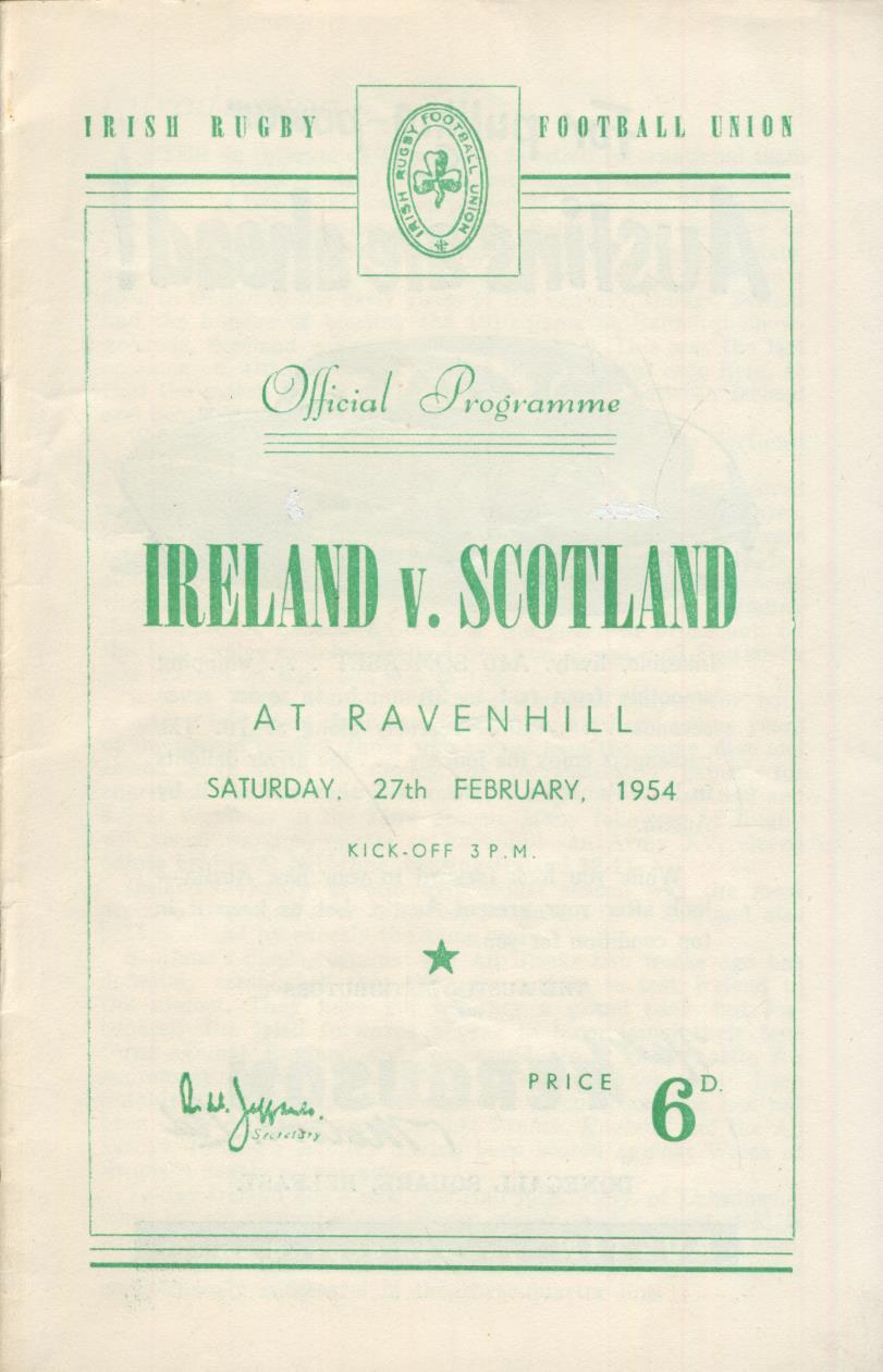 Official programme for Ireland v Scotland in the Five Nations played at Ravenhill, Belfast, on 27 February 1954. This was the last Five Nations match played at Ravenhill.
