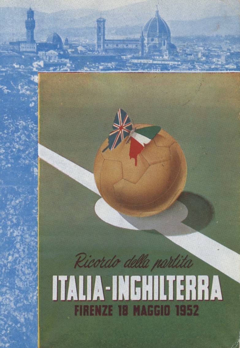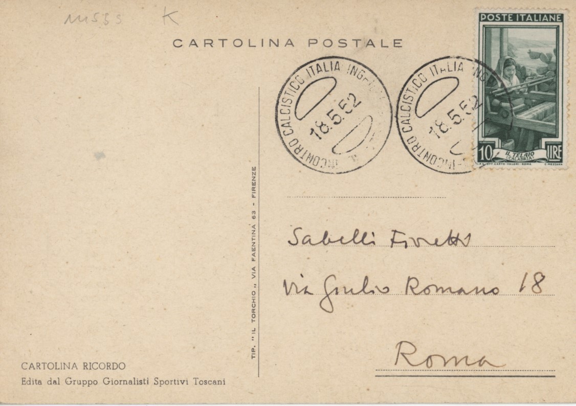 Original postcard printed to commemorate the match between Italy and England, played in Florence on May 18th, 1952. The match ended 1-1.