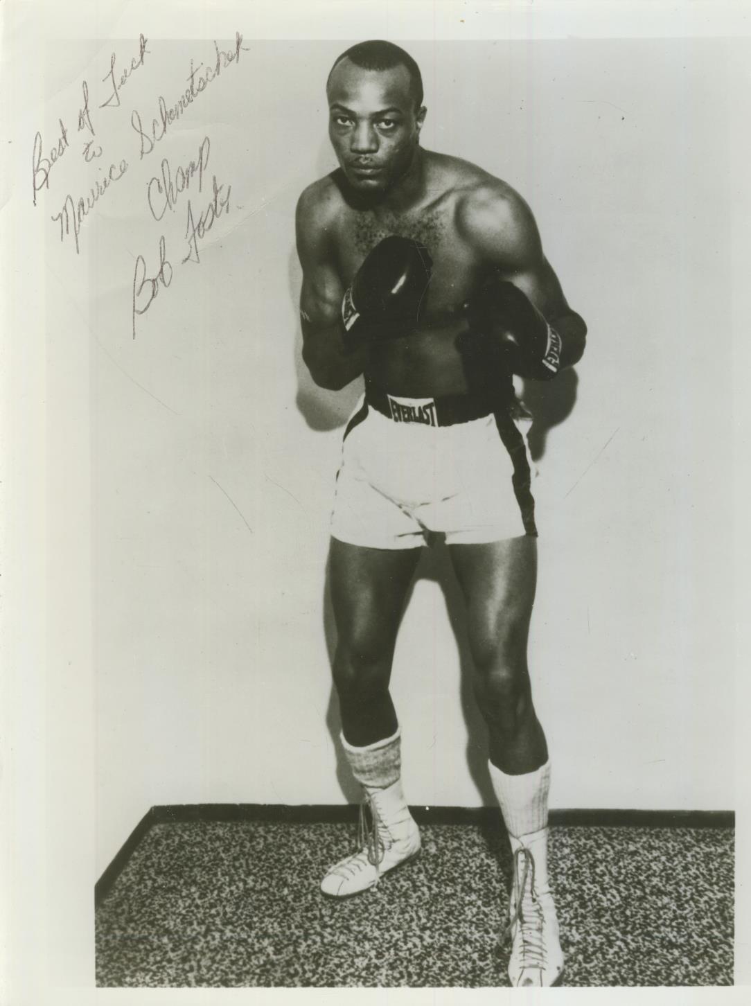 Portrait of the US World Light Heavyweight Champion who was defeated by Ali and Frazier. Known as 'The Deputy Sherriff'. Signed to the front by Foster with a dedication.