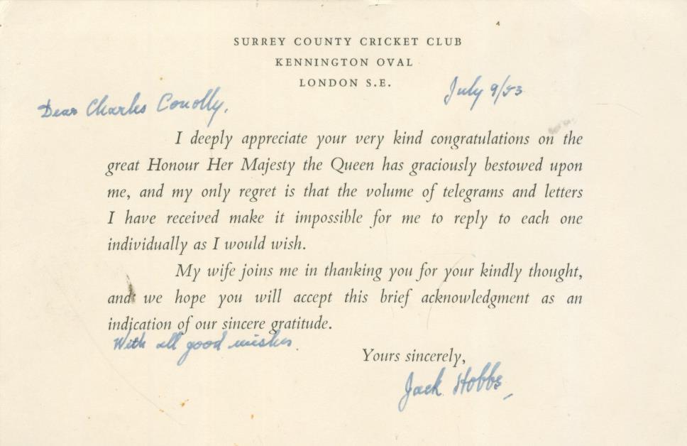 Printed note on Surrey CCC headed card from Sir Jack Hobbs to a well-wisher (Charles Conolly) thanking him for his "very kind congratulations on the great Honour Her Majesty the Queen has graciously bestowed upon me". Dedicated, dated and signed nicely by Hobbs in ink.