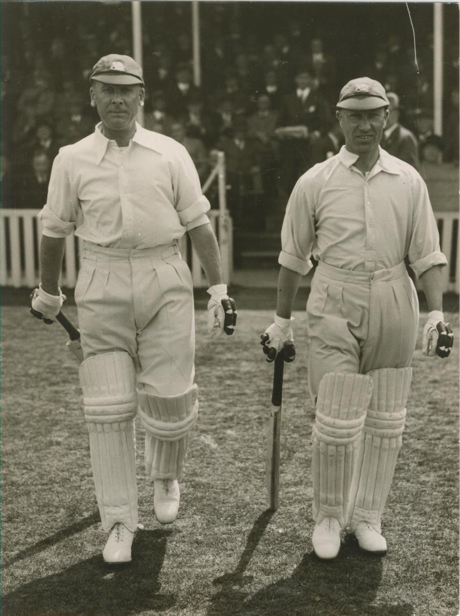 Original Press photograph of Hobbs and Sandham going out to bat for Surrey CCC during the 1930s.