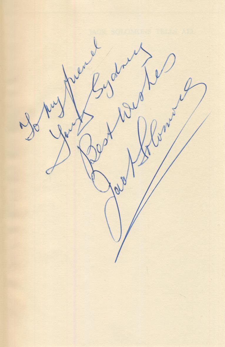 1st edition. 8vo. Dust-wrapper, lightly rubbed to edges. Signed dedication to the well-known boxing reporter Sydney Hulls, who was also the son of Solomons' fellow boxing promoter Syd Hulls, on the fly leaf, 'To my friend young Sydney. Best Wishes Jack Solomons".