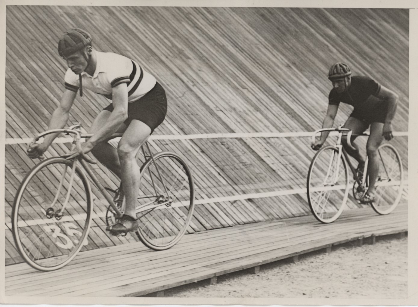 Original Press photograph of Scherens and Richter riding during the 1935 UCI World Championship sprint final in Brussels. The Belgian Scherens won, which was part of a six year winning streak. Albert Richter, who openly opposed Hitler, was murdered by the Gestapo after being dragged from a train in 1940.