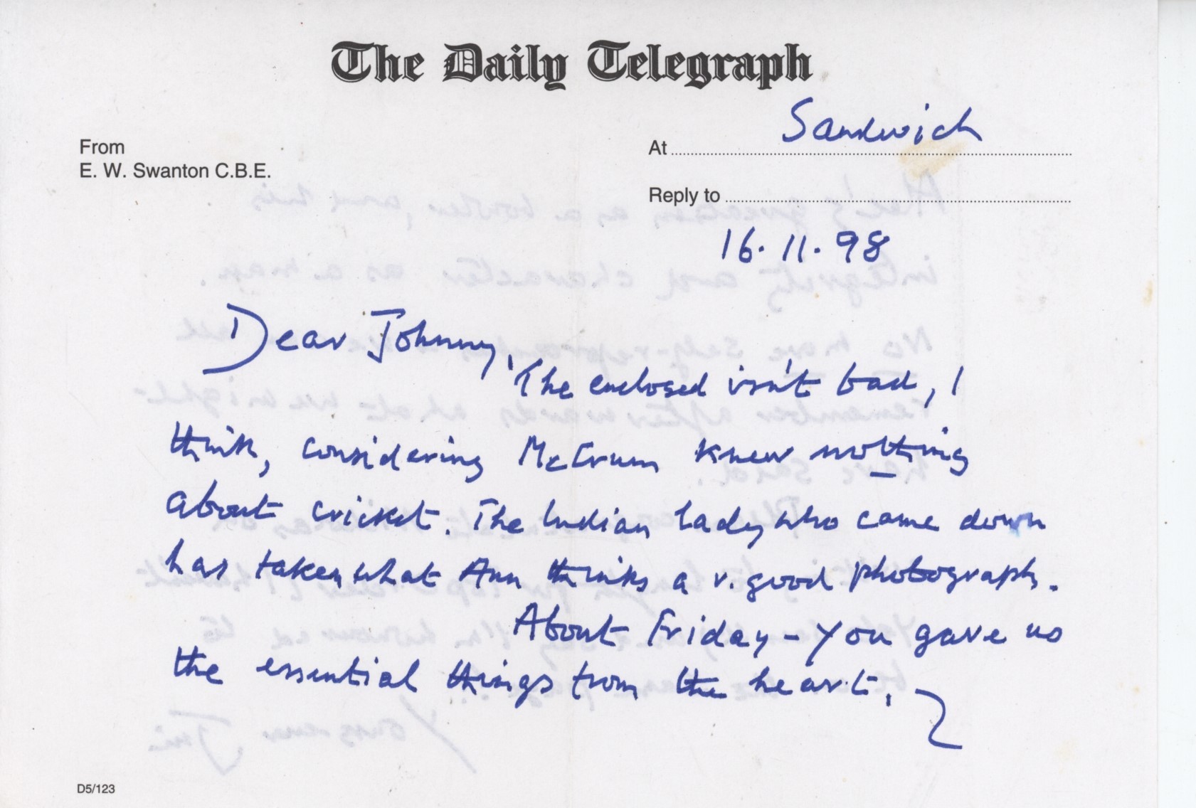 Handwritten cricket letter from E.W Swanton his fellow cricket journalist John Woodcock, dated November 1998. Swanton talks about an article, which he has enclosed (and is included here), written in the Observer the day before about Swanton and his experience of watching cricket in Australia. "The enclosed isn't bad, I think, considering McCrum (the journalist) knew nothing about cricket." There is also mention of Alec Bedser and Woodcock's regret that he had not been more fulsome in his praise of Bedser (what this refers to is not clear).