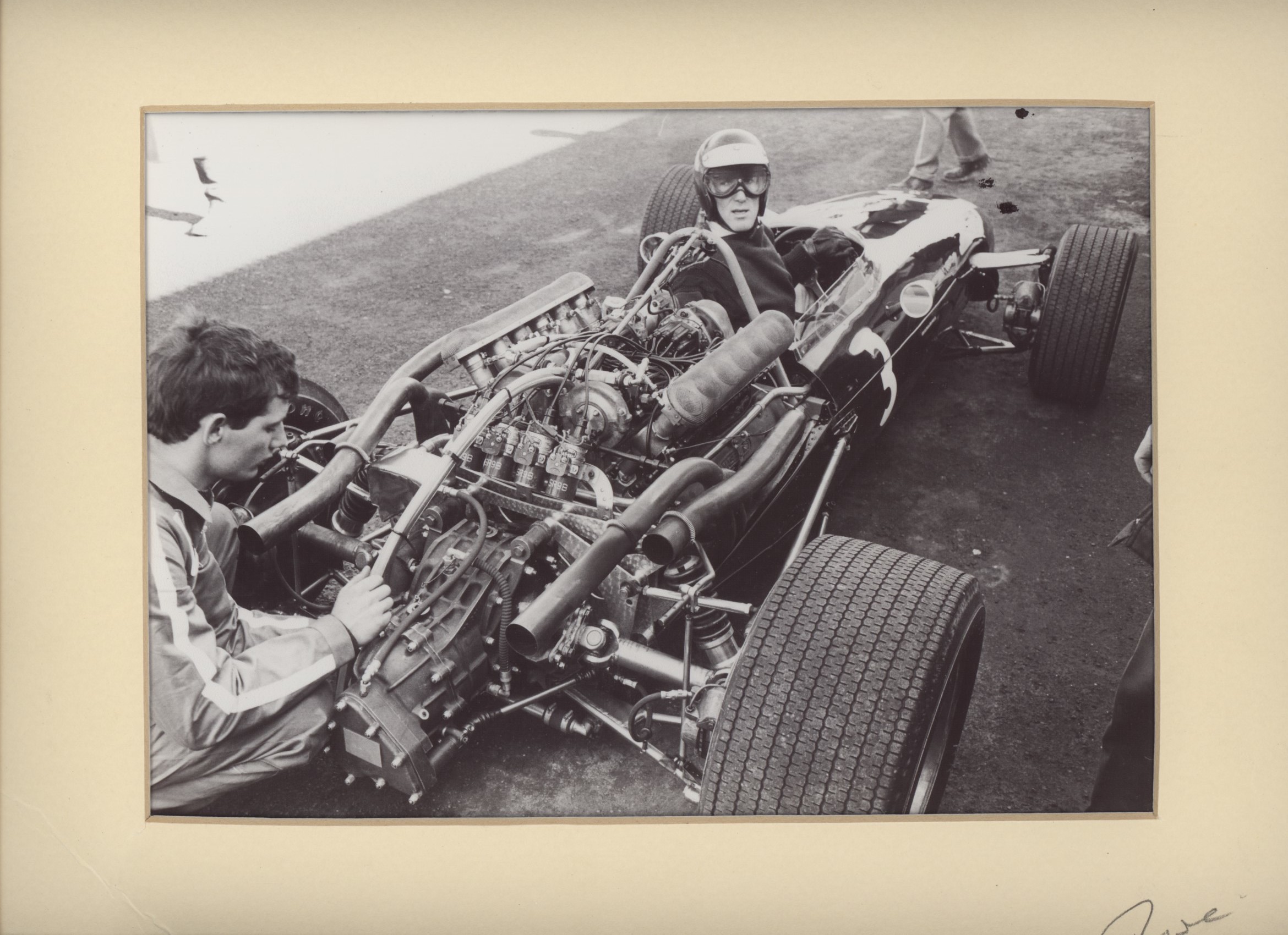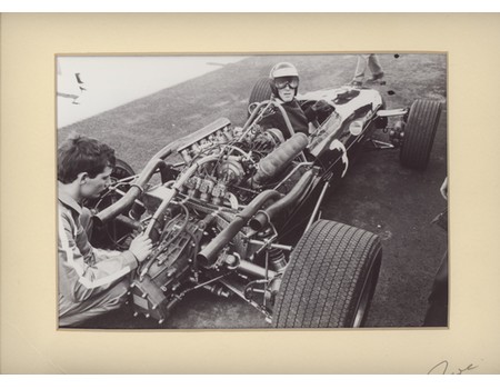 Photograph by the well-known motor racing photographer, Maurice Rowe, of Jochen Rindt at Brands Hatch in 1967 in his Cooper-Maserati, with a very young Ron Dennis taking a look at the engine.