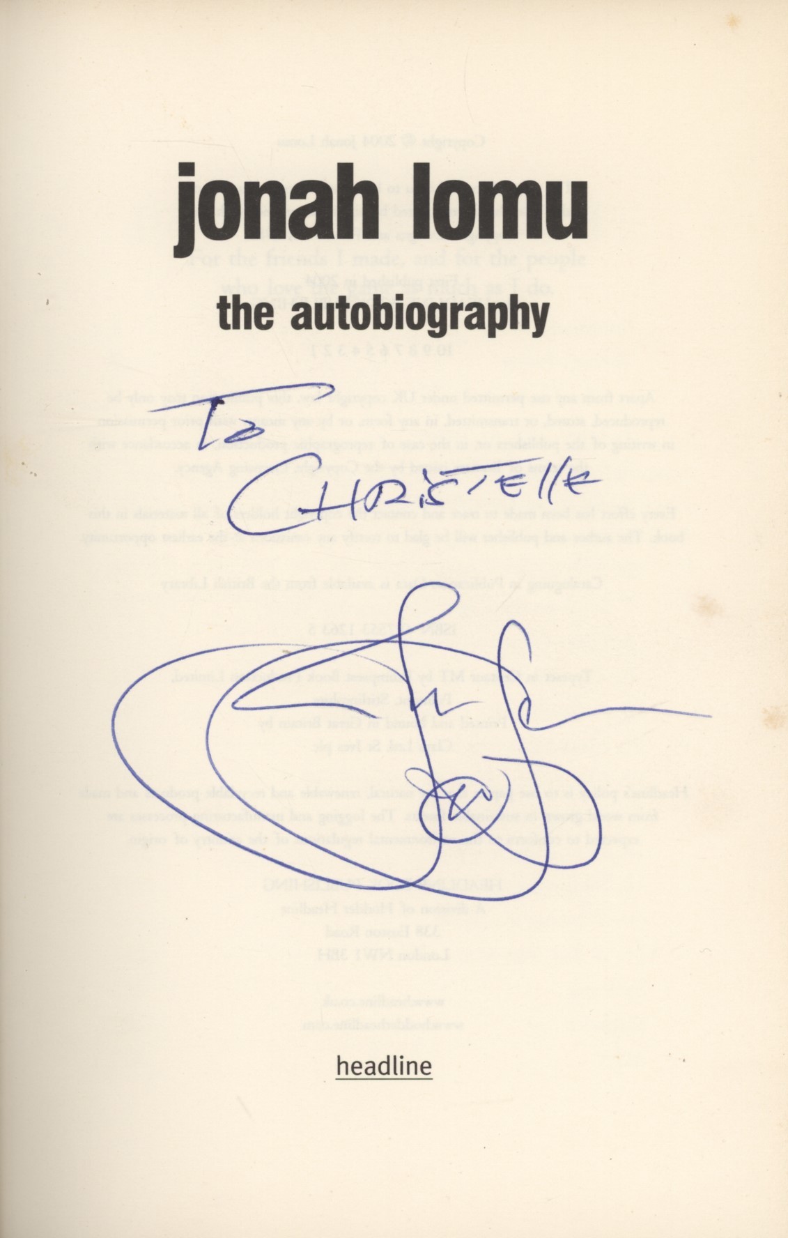 8vo. 314pp. plus 24 pages of photos. Some light foxing to edges of page block and occasionally inside. Dust-wrapper, very good. Signed and dedicated to the title page by Lomu.