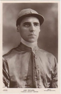 Real photograph by J. Beagles & Co. Ltd. of Joe Childs, winner of the Derby in 1916, 1918 and 1926. Also won the Oaks and St Leger four times and the 1000 and 2000 Guineas twice each. Contains a reasonably full biographical sketch. "Famous Jockey Series" #385F. Postally unused. VG.