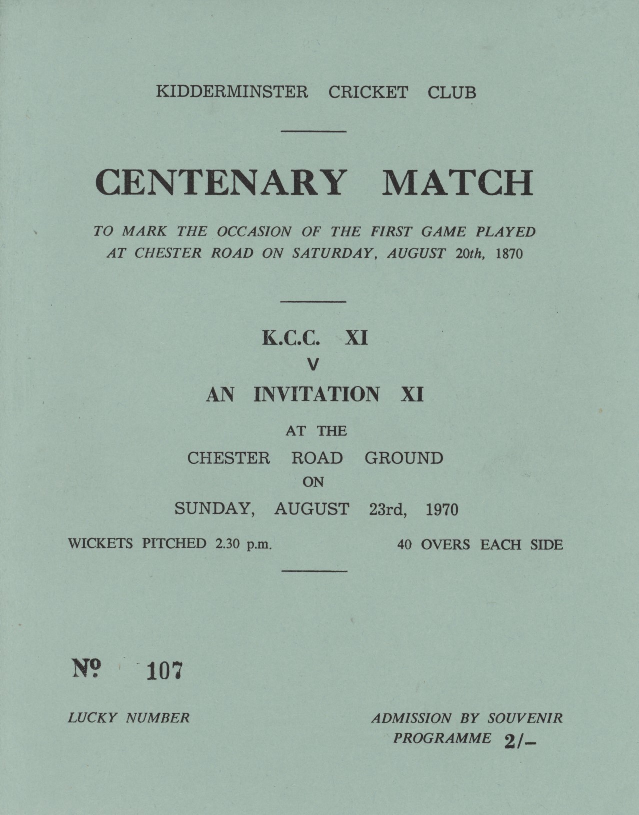 Played at Chester Road, Kidderminster on 23rd August 1970 to mark the occasion of the first game played at Chester Road on August 20th 1870. Fred Rumsey played.
