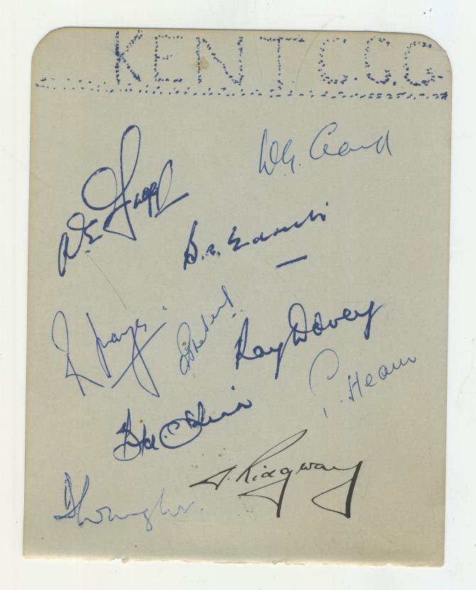 Album page. Signed in ink by 10 Kent players, including Fagg, Dovey, Hearn, Ridgway, Edrich and Phebey. The reverse is signed by 10 Devon cricketers from 1951.