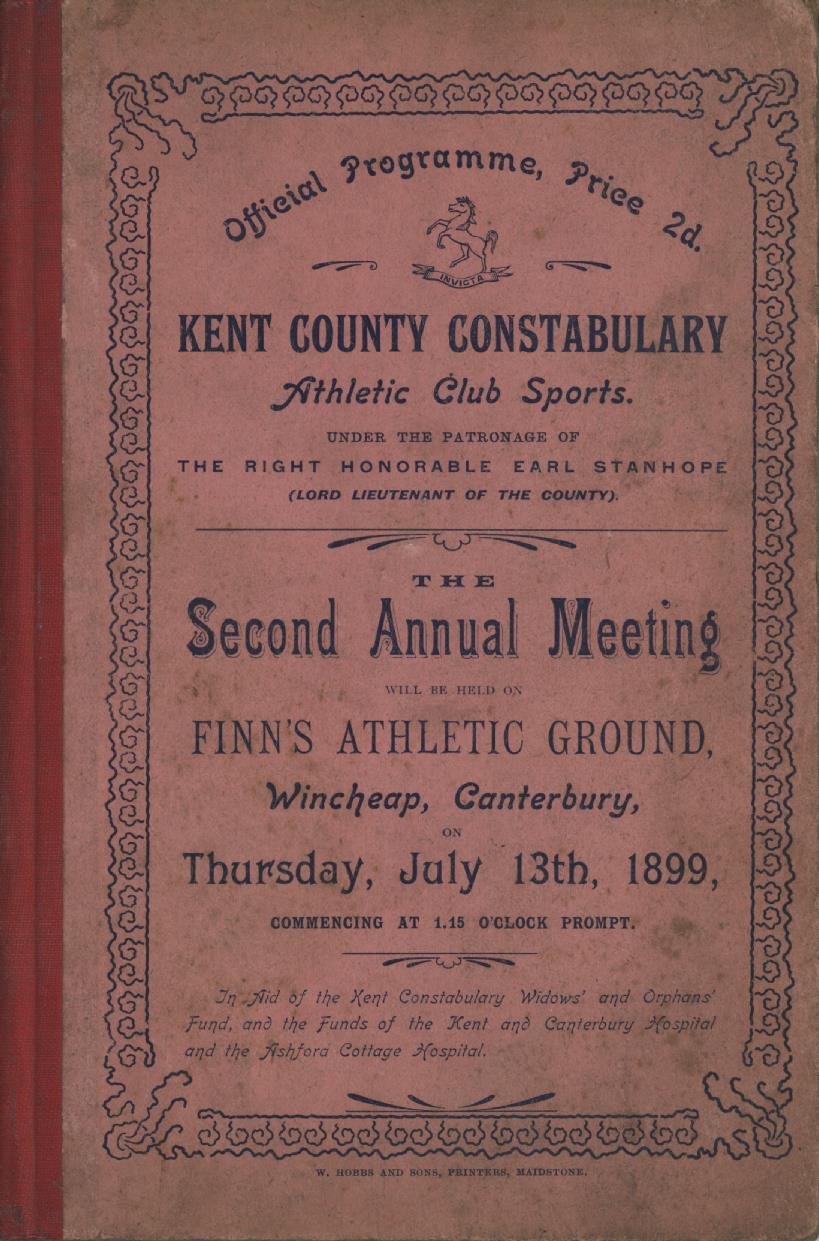 Official programme for the Second Annual Meeting of the Kent County Constabulary Athletic Club Sports, held at Finn's Athletic Ground, Canterbury, on July 13th, 1899. Lists all competitors in each event with mainly pencil results written in.