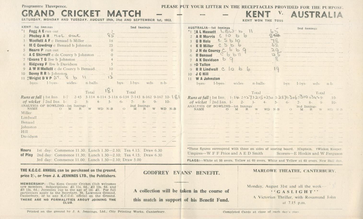 KENT V AUSTRALIA 1953 CRICKET SCORECARD