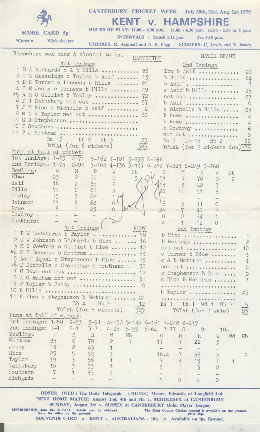 Fully printed scorecard or the match played at Canterbury on July 30-August 1, 1975. Match drawn.