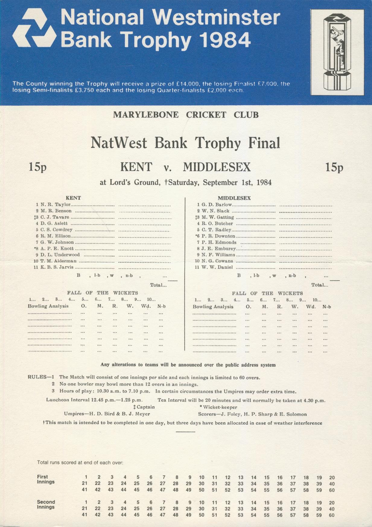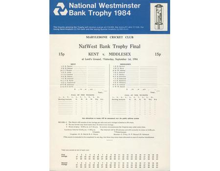 KENT V MIDDLESEX (LORD'S) 1984 NATWEST TROPHY FINAL CRICKET SCORECARD
