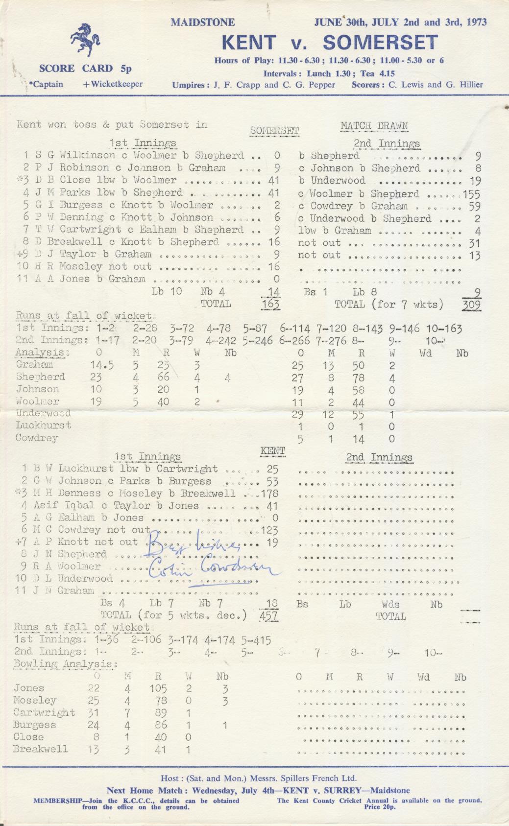 Fully printed. Very good condition. Signed nicely by Cowdrey next to his score.