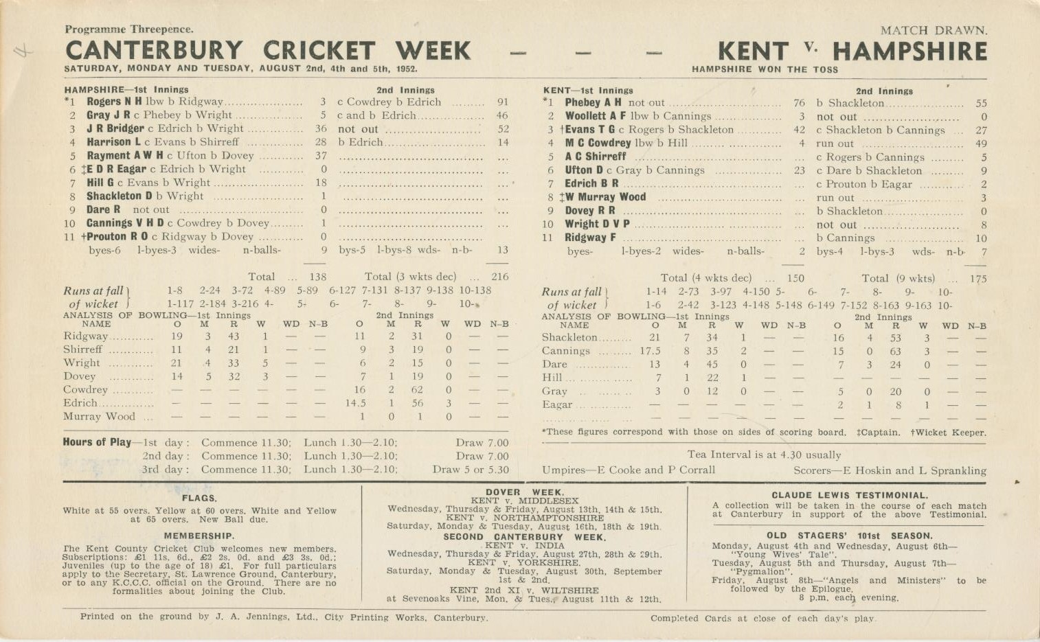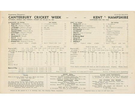 KENT V HAMPSHIRE 1952 CRICKET SCORECARD
