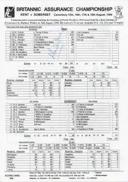 Cricket » Cricket Scorecards » Kent » KENT V SOMERSET 1996 (WALKER 275 NOT OUT) SIGNED CRICKET SCORECARD