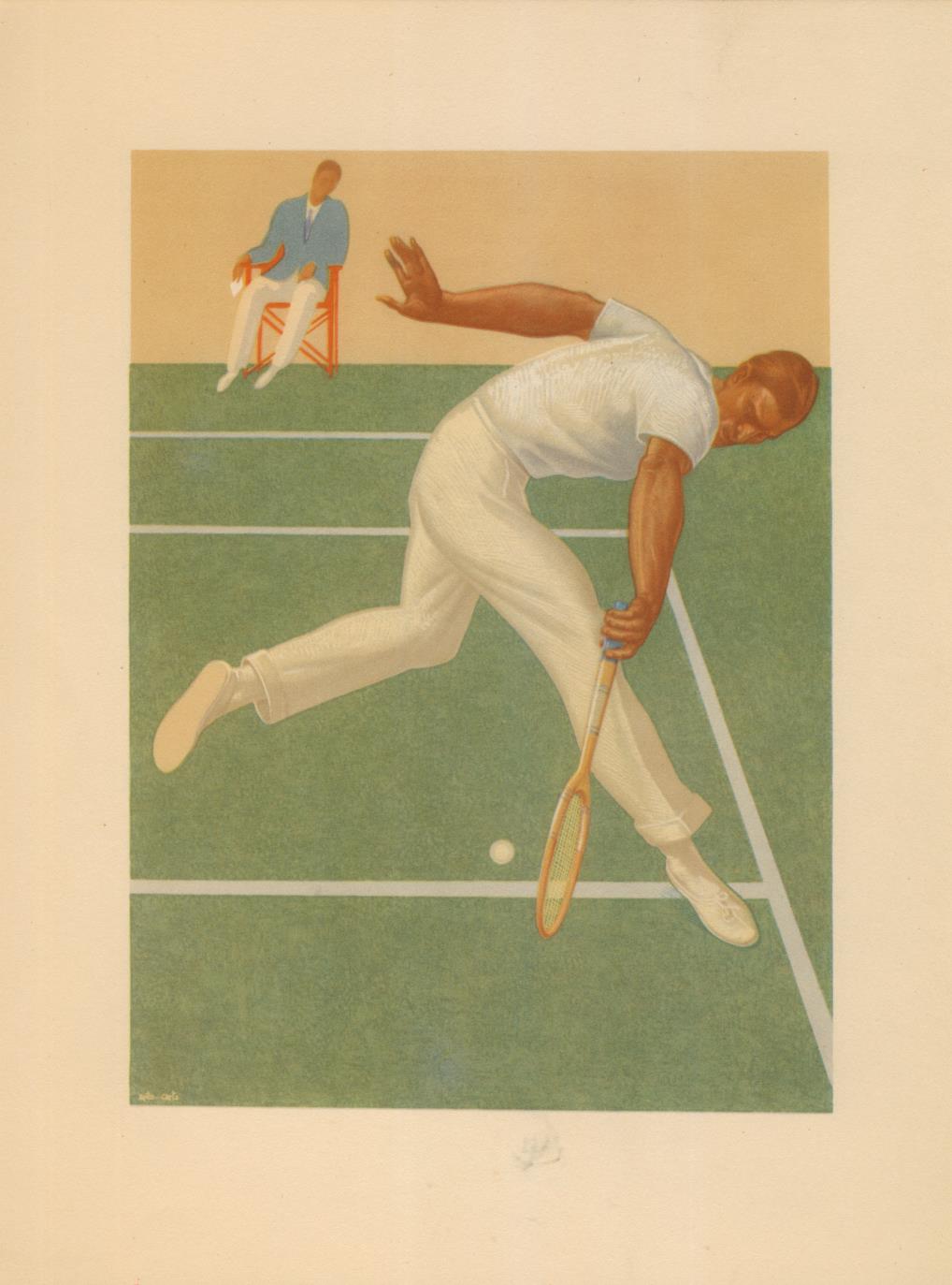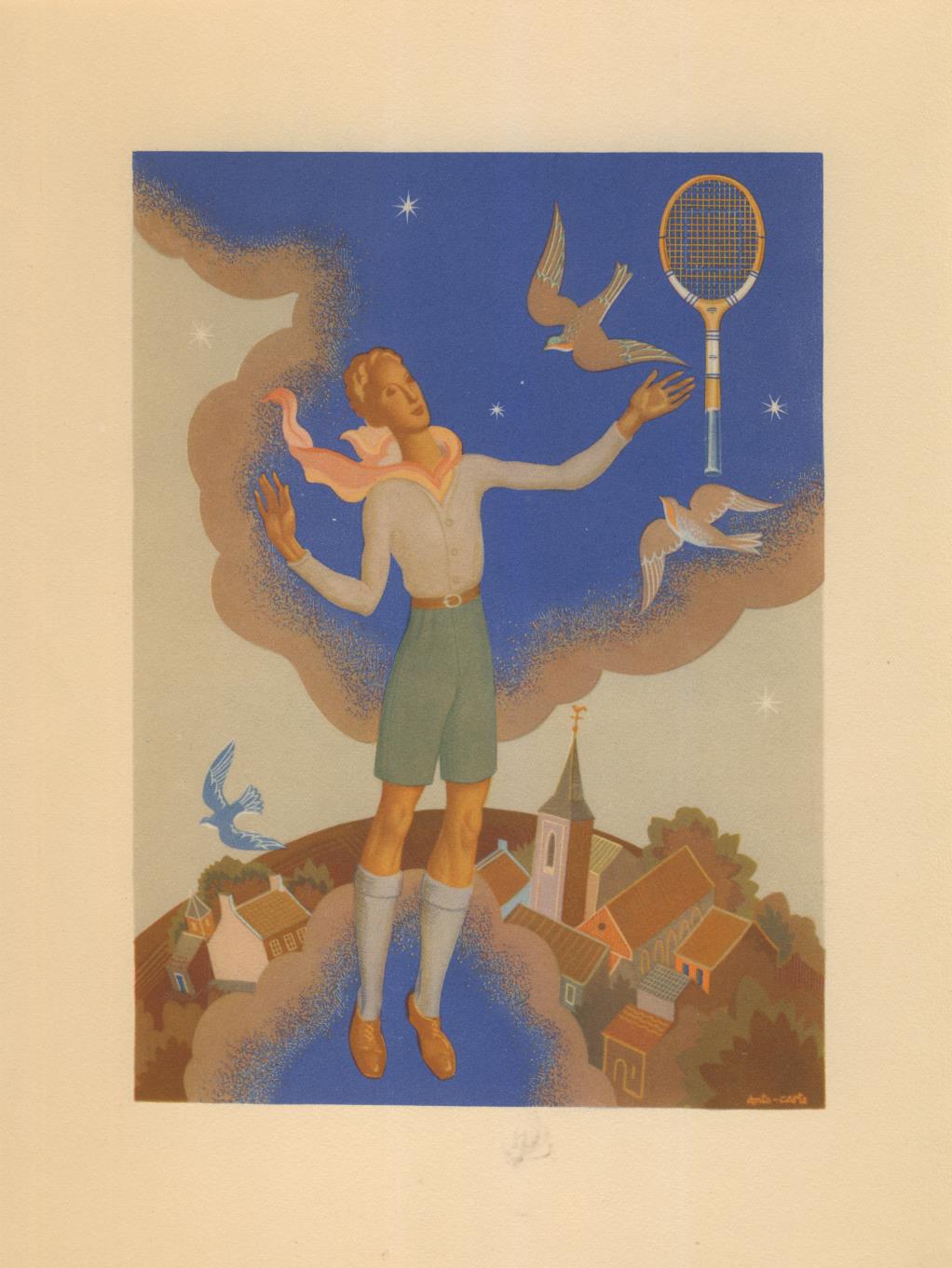 Advertising brochure produced by the Belgian tennis racket makers, Donnay, with stunning full-page colour illustrations throughout by Anto-Carte.