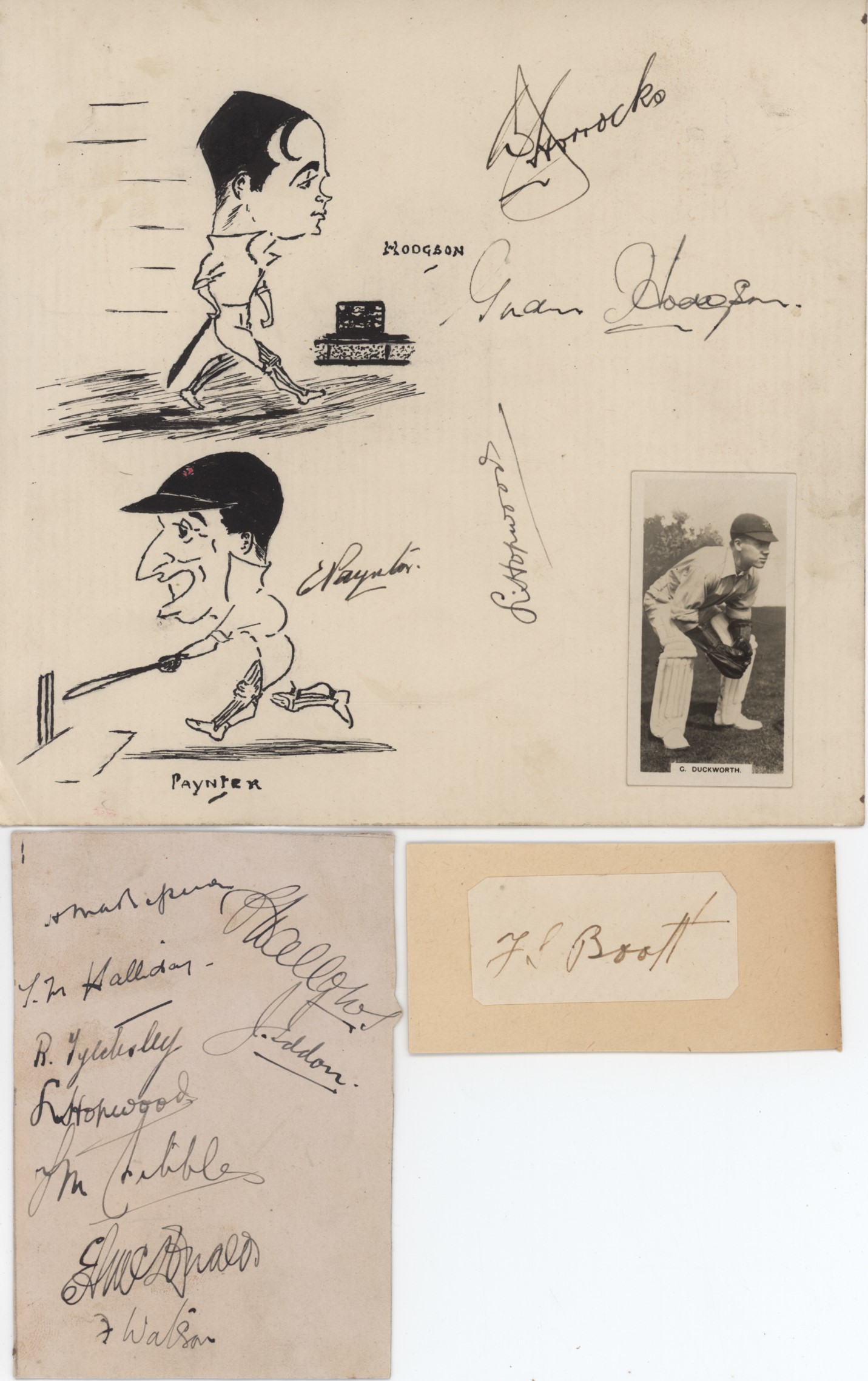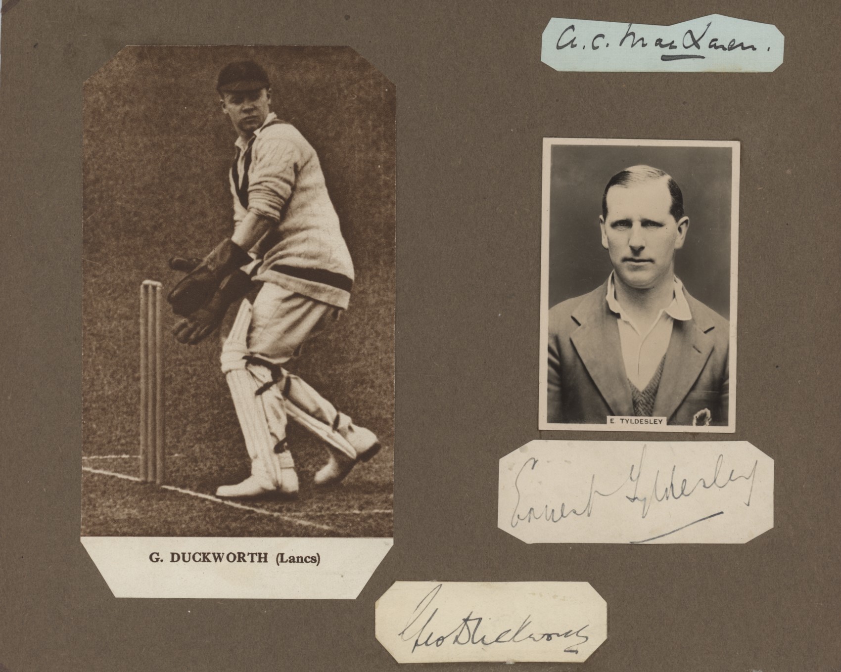 A small group of cards and sheets signed by 16 Lancashire cricketers, mainly from the early 1930s. These are Archie MacLaren, Ernest Tyldesley, George Duckworth, Frank Booth, Bill Horrocks, Gordon Hodgson, Eddie Paynter, Len Hopwood (twice), Harry Makepeace, Thomas Halliday, Dick Tyldesley, Frank Watson, Jack Iddon, Frank Sibbles, Ted McDonald and Charlie Hallows.