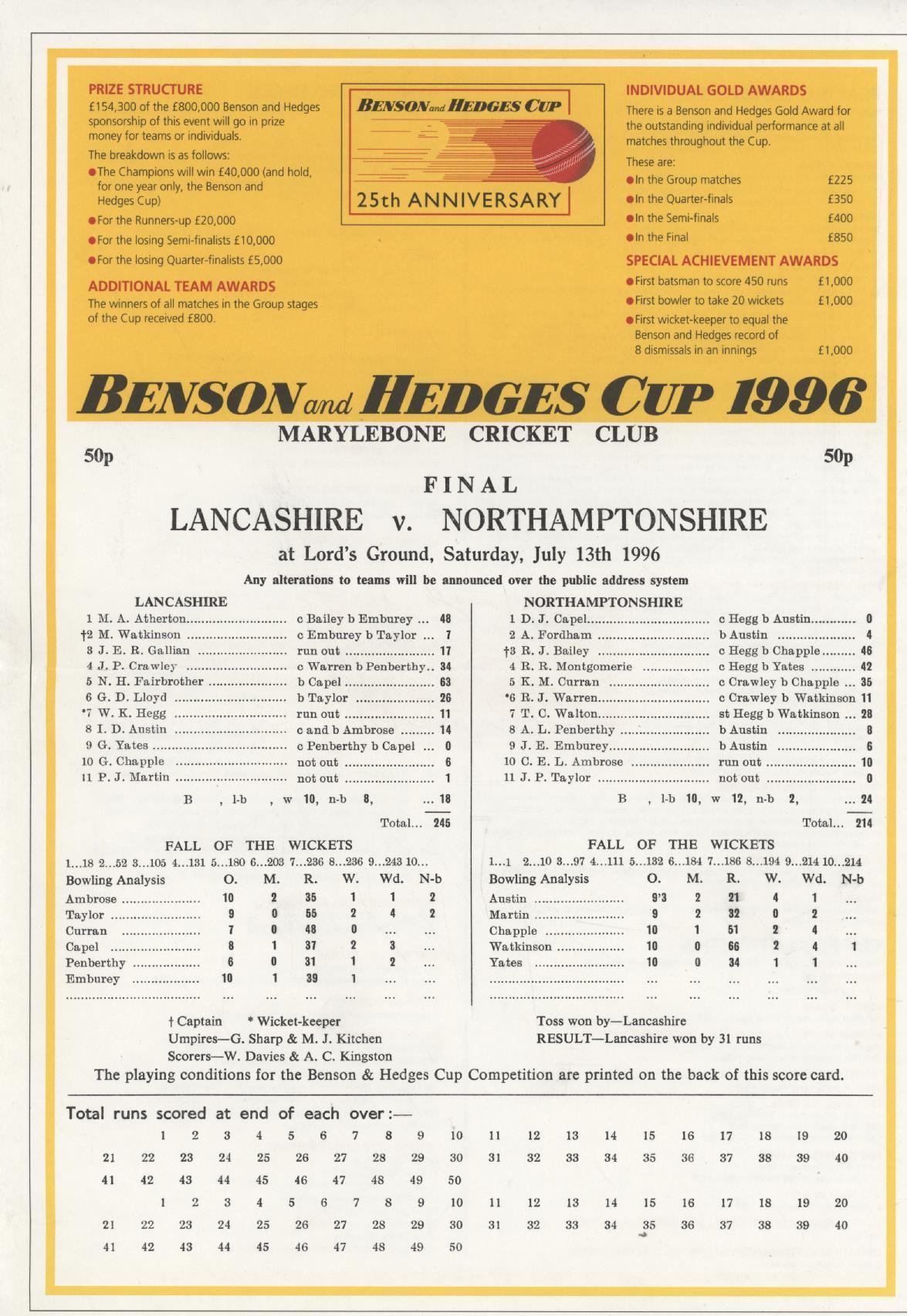 LANCASHIRE V NORTHAMPTONSHIRE 1996 (BENSON AND HEDGES FINAL) CRICKET SCORECARD
