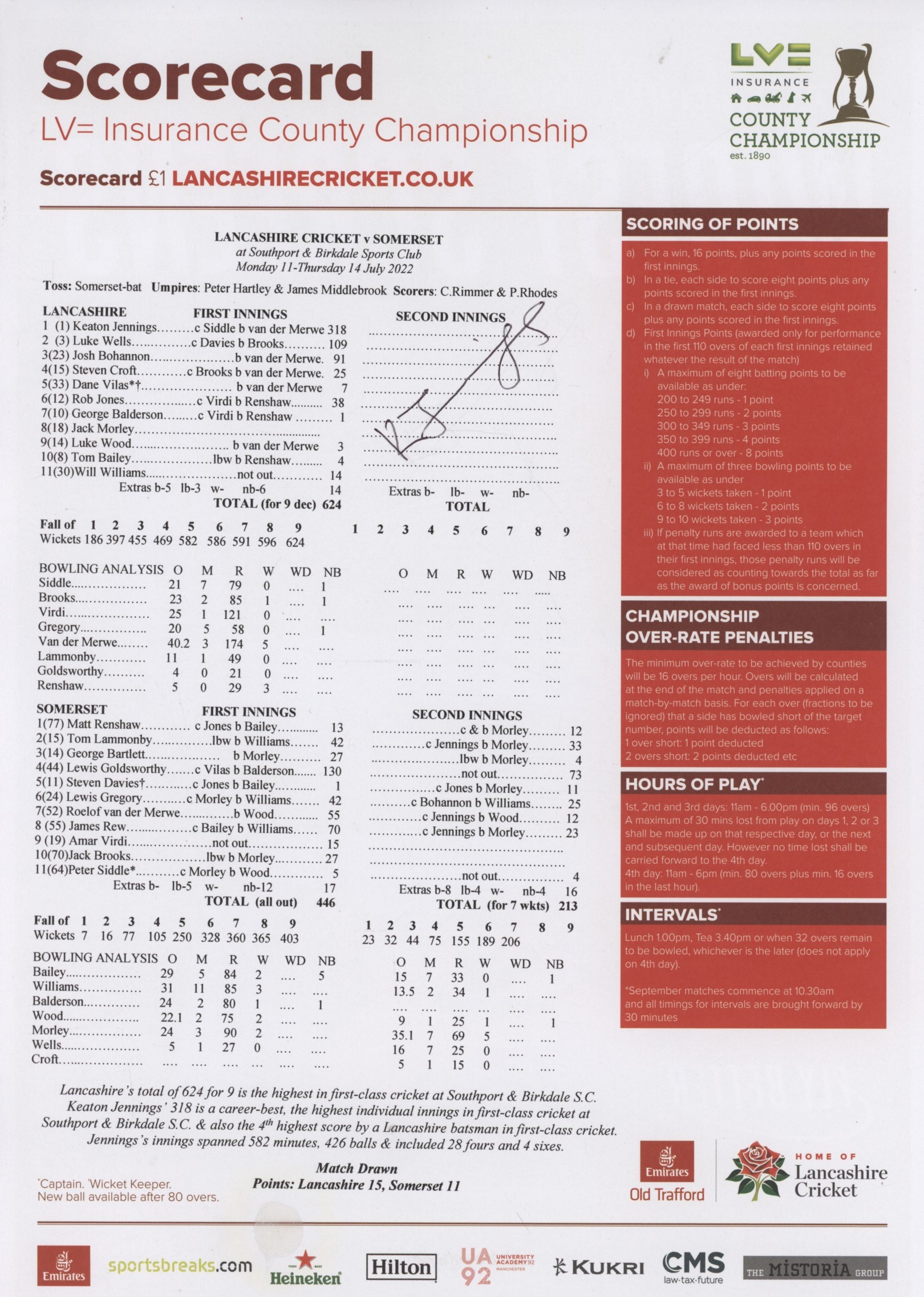 Cricket » Cricket Scorecards » Lancashire » LANCASHIRE V SOMERSET 2022 SIGNED CRICKET SCORECARD - JENNINGS 318