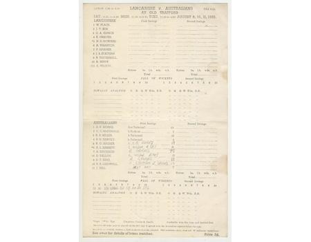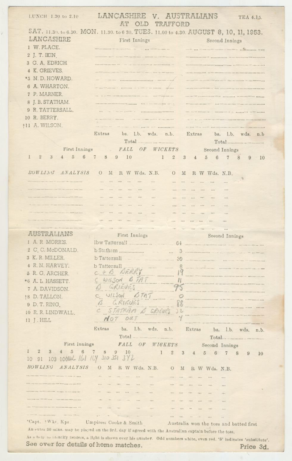 LANCASHIRE V AUSTRALIANS 1953 CRICKET SCORECARD