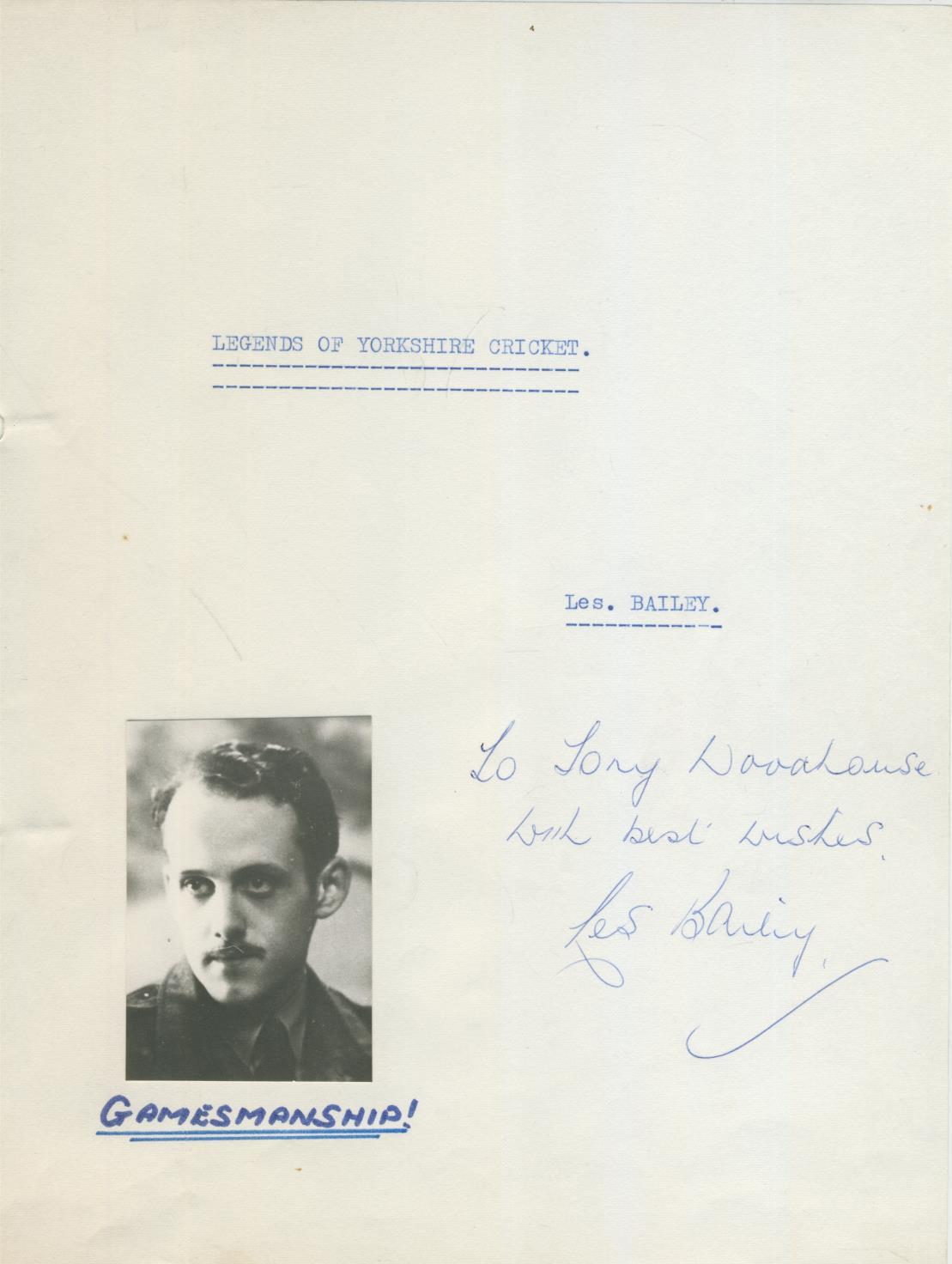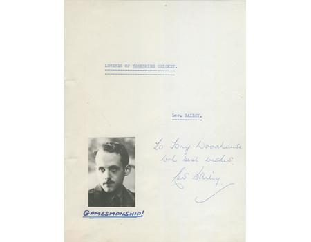 The story of Yorkshire cricket recorded in verse, remembering many of the great players through the ages. Les Bailey was was a well-known figure around Yorkshire cricket. Typescript, with handwritten captions to the photographs.