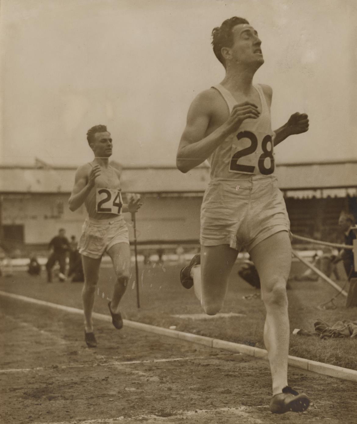 Original Press photograph of Len Eyre winning the Mile Race at the British Games at White City Stadium on May 29th, 1950. His great rival Bill Nankeville is left trailing.