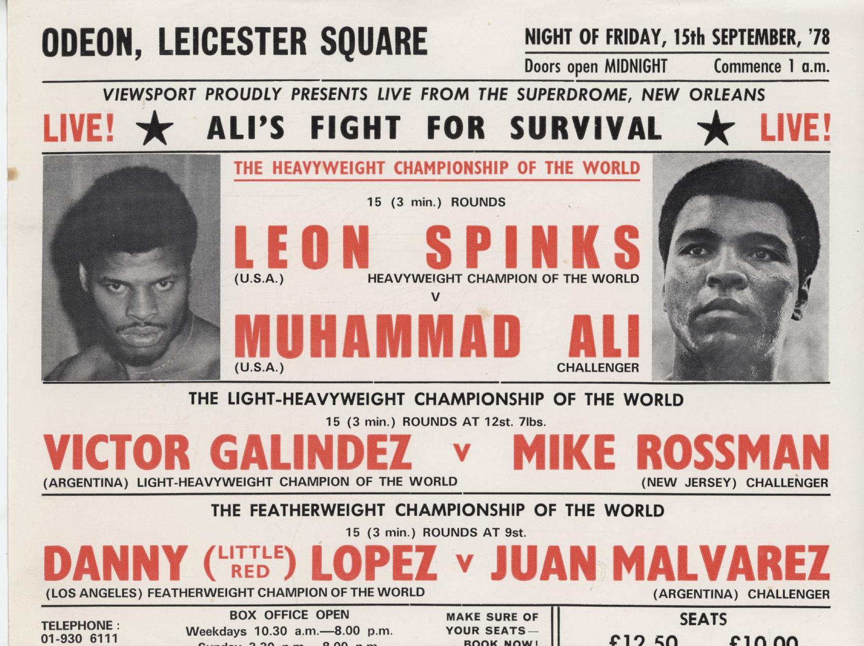 Original flyer for the live broadcast at the Odeon, Leicester Square, of the World Heavyweight title fight from the Superdome, New Orleans on 15th September 1978.