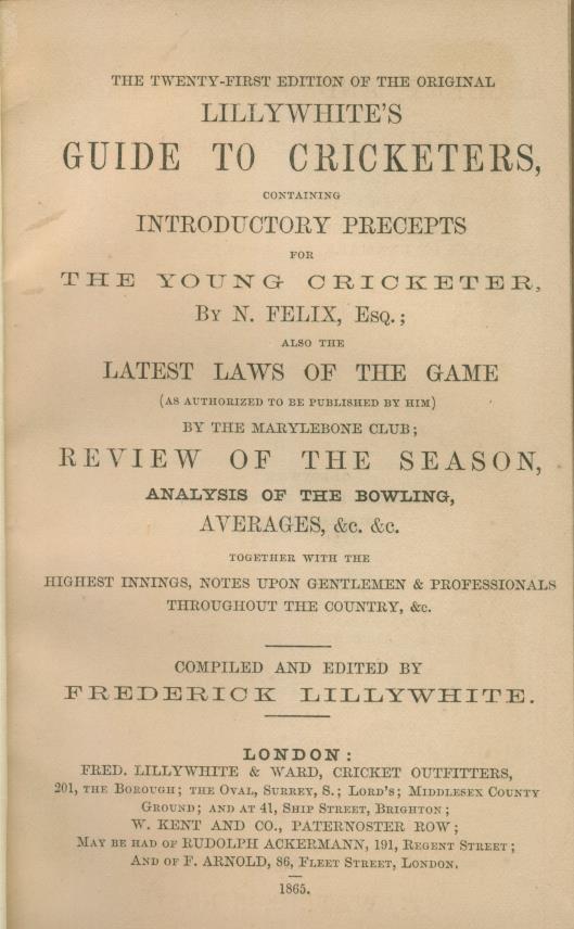Fred Lillywhite's guides were published annually from 1849 to 1866. The work was subequently incorporated with John Lillywhite's Cricketer's Companion, the third issue of which, published 1867, is called the 23rd edition of the Guide. This is the twenty-first edition.