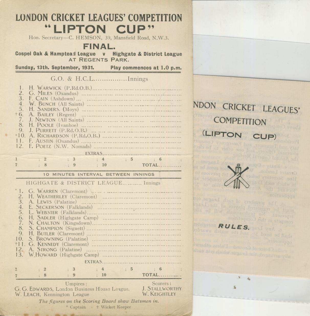 Official scorecard for the "Lipton Cup" final, played between Gospel Oak & Hampstead League and Highgate & District League on September 13th 1931, at Regents Park. Results not completed. Comes with a rule sheet for the competition.