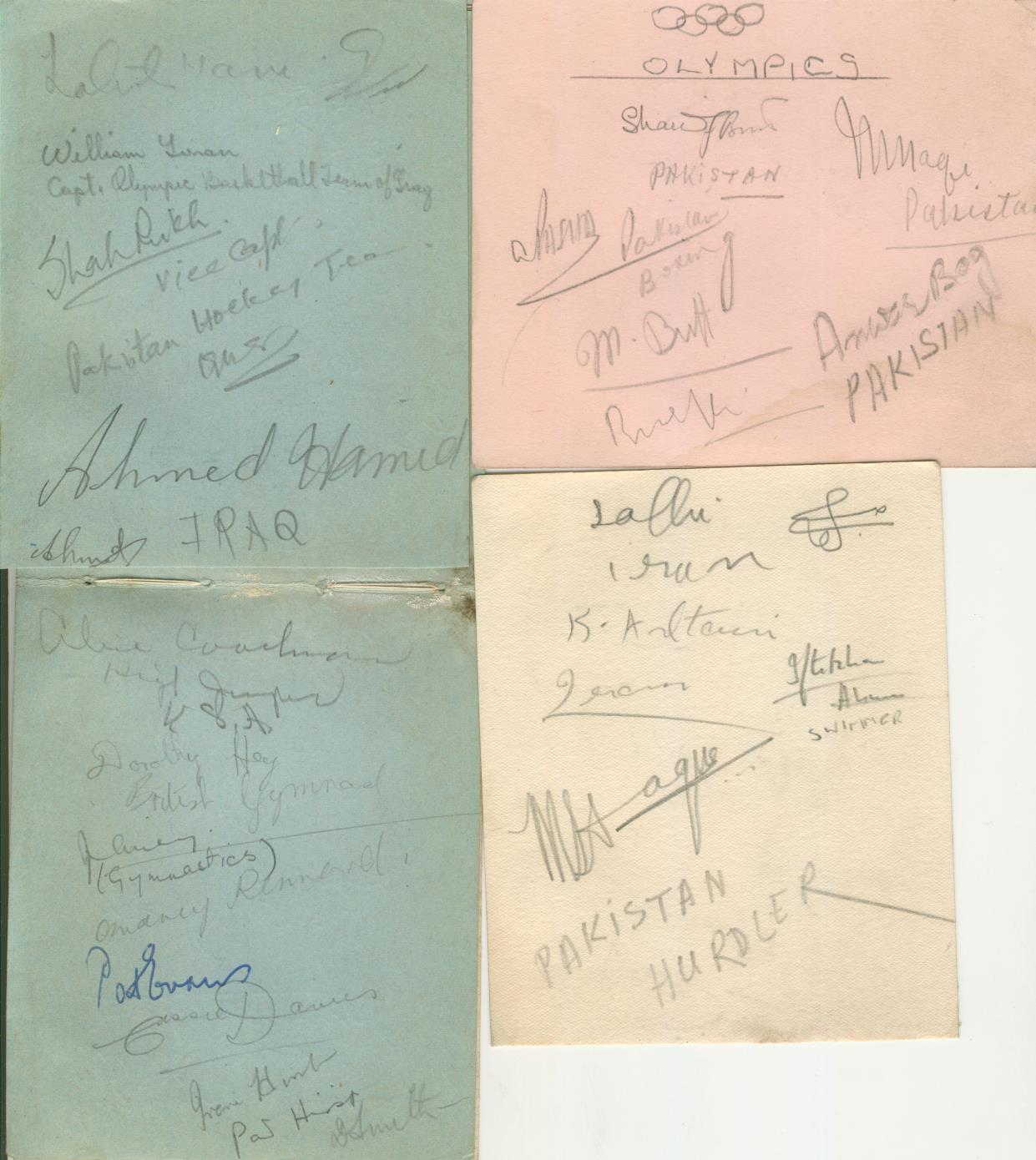 Ten autograph album pages, signed front and back in pencil by competitors at the London Olympics. Many players from the Pakistan hockey team present plus Pakistan boxers, hurdlers, swimmers and cyclists. Also noted are competitors from Iran, Iraq, Burma, Puerto Rico and Turkey and the singer and actress, Celia Lipton. Also members of the British Gymnastics team .....