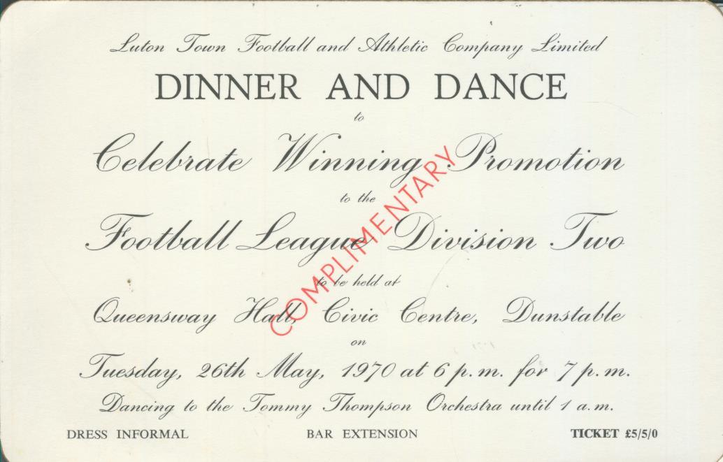 Invitation card for the Luton Town dinner and dance to celebrate winning promotion to Division Two, held at the Queensway Hall, Dunstable, on May 26th 1970.