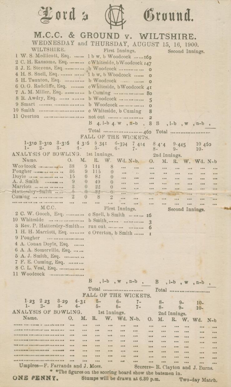 Official scorecard for the match played at Lord's on August 15-16, 1900. Wiltshire started with an opening partnership of 310, before stumbling to 316 for 4. Their final total was 460. The printed score shows that the MCC lost 4 early wickets with Sir Arthur Conan Doyle next in at number 6. The rest is unknown.