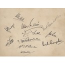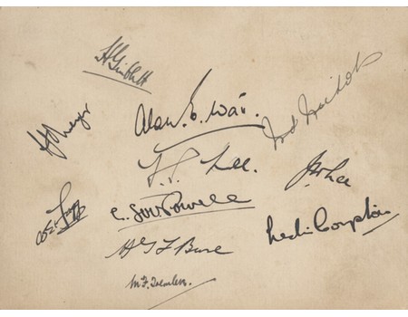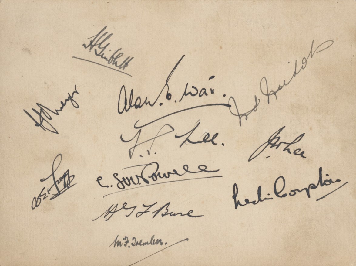 Cricket scorecard, listing teams only, for an exhibition cricket match on May 27, 1941. Signed in ink on the reverse by 11 players - RJO Meyer, H Gimblett, F Lee, J Lee, H Buse, MF Tremlett and LSt.V Powell (all of Somerset); A Fagg and AE Watt (Kent); MS Nichols (Essex) and L Compton (Middlesex).