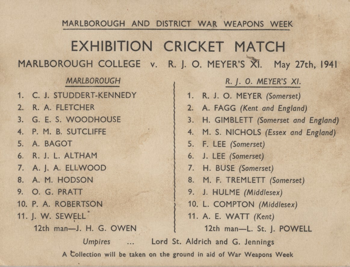 Cricket » Cricket Scorecards » Schools/Universities » MARLBOROUGH COLLEGE V R.J.O.MEYER'S XI 1941 SIGNED CRICKET SCORECARD - INCLUDING FAGG, GIMBLETT, COMPTON ETC.
