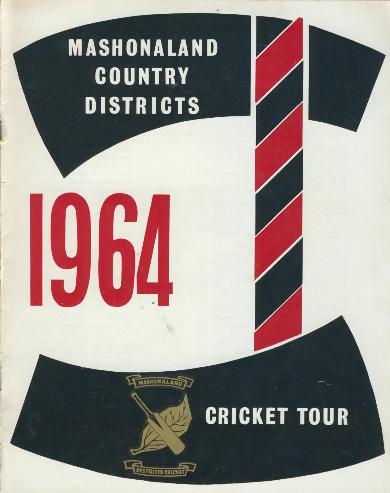Pre-tour brochure for the tour by the Mashonaland Country Districts team in England 1964. The team played a number of strong club sides and lost only two matches. They were described by Prime Minister Ian Smith as 'a fine advertisement for Rhodesia'.
